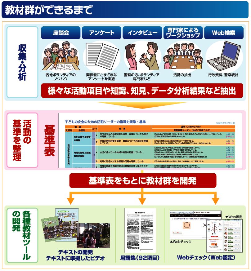 多くの子供たちを多様化する犯罪から守るには、地域の犯罪に対する取り組みが有効に働くことが経験的に検証され始めています。私たちはその一端を担おうと、子どもの防犯に関するボランティアリーダー向けの学習用テキストを体系的に開発することを目的に取り組んできました。